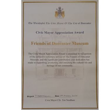 This award recognises not only the work of our trustees but also the support we receive from you our members and donors, and I thank you all for enabling our charity to continue with its support of Doncaster's Museums, Art Gallery and the City of Doncaster Archives.
